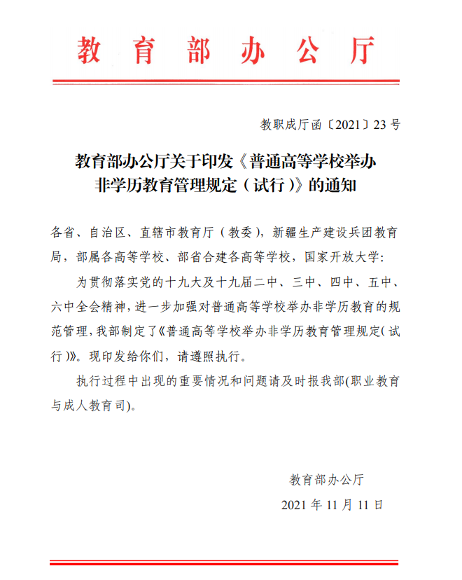 第二条 本规定所称非学历教育是指高校在学历教育之外面向社会举办的,以提升受教育者专业素质、职业技能、文化水平或者满足个人兴趣等为目的的各类培训、进修、研修、辅导等教育活动。以获得高等教育自学考试毕业证书为目的的自学考试辅导不在本规定的适用范围内。